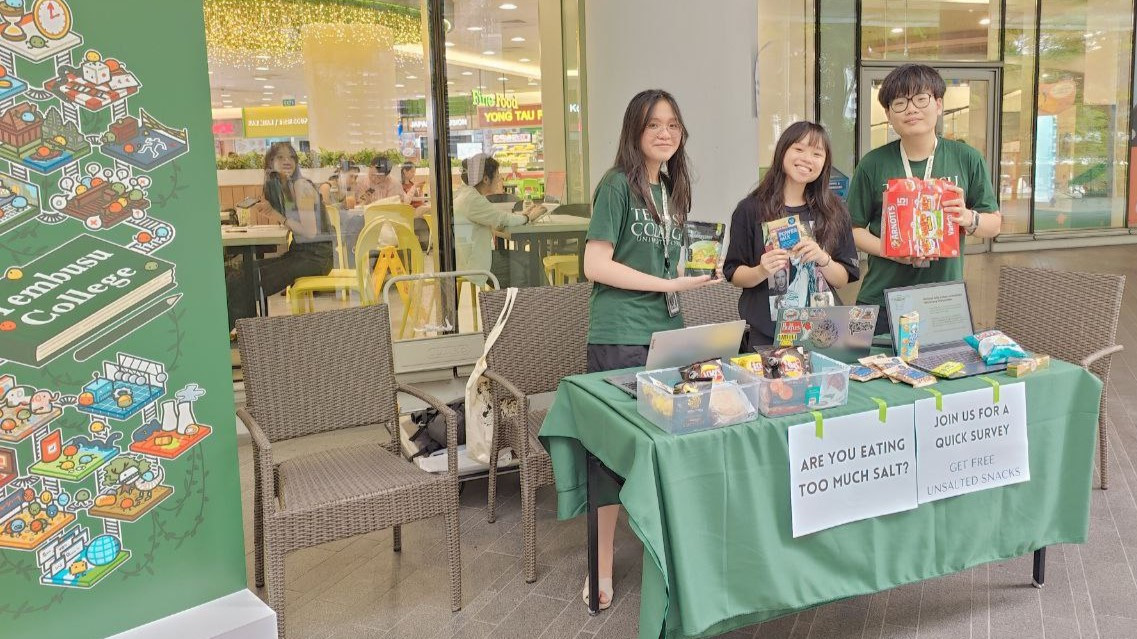 Tembusu College students engage peers at an NUS University Town roadshow, raising awareness about low-sodium diets while gathering survey responses.In another course,